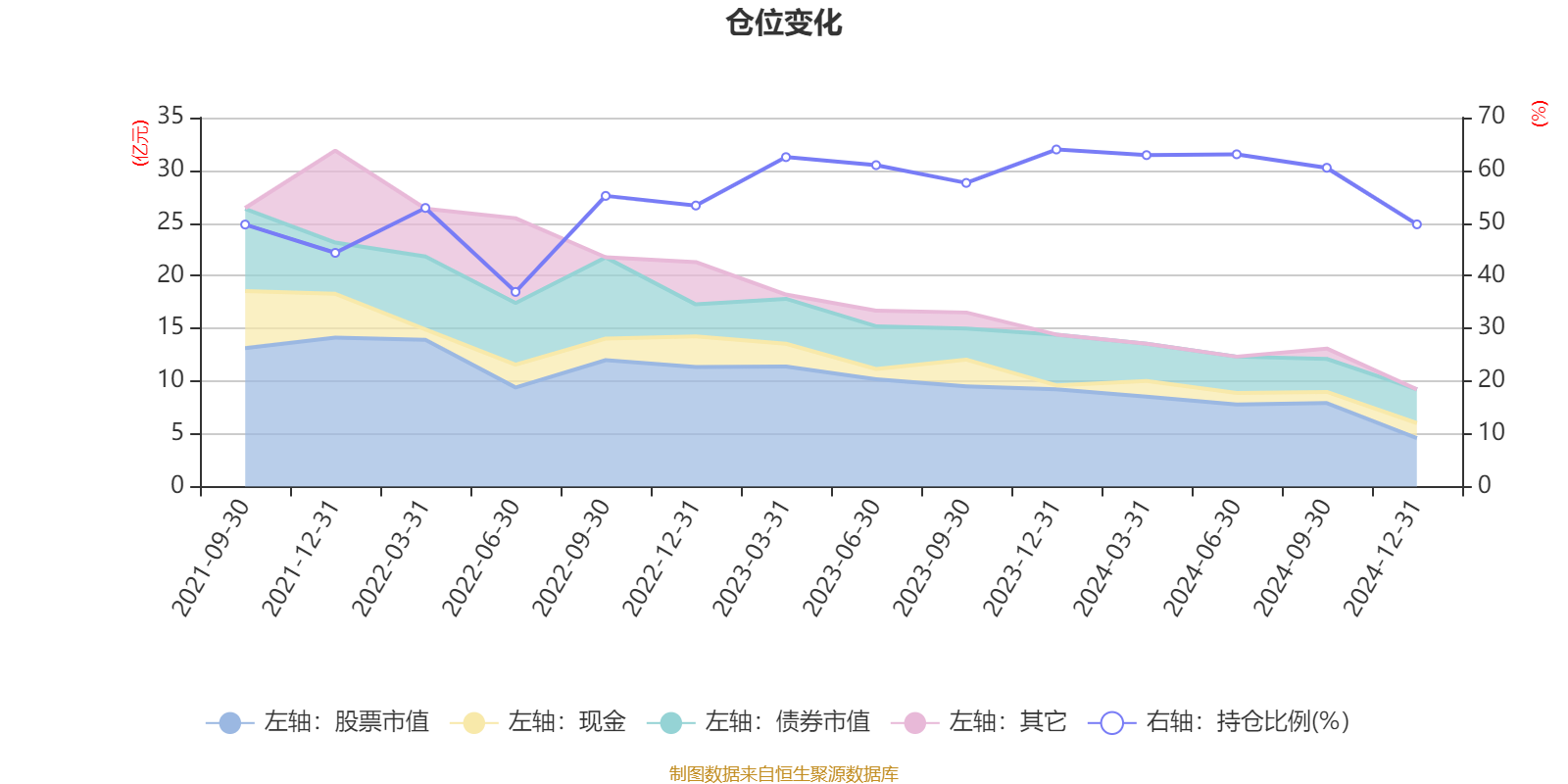据定期报告数据统计,近三年平均股票仓位为56.62%,同类平均为79.88%。2023年末基金达到63.95%的最高仓位,2022年上半年末最低,为36.93%。