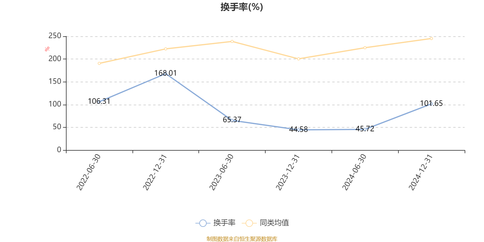 截至2024年12月31日,基金最近一年换手率约141.52%,持续低于同类均值。